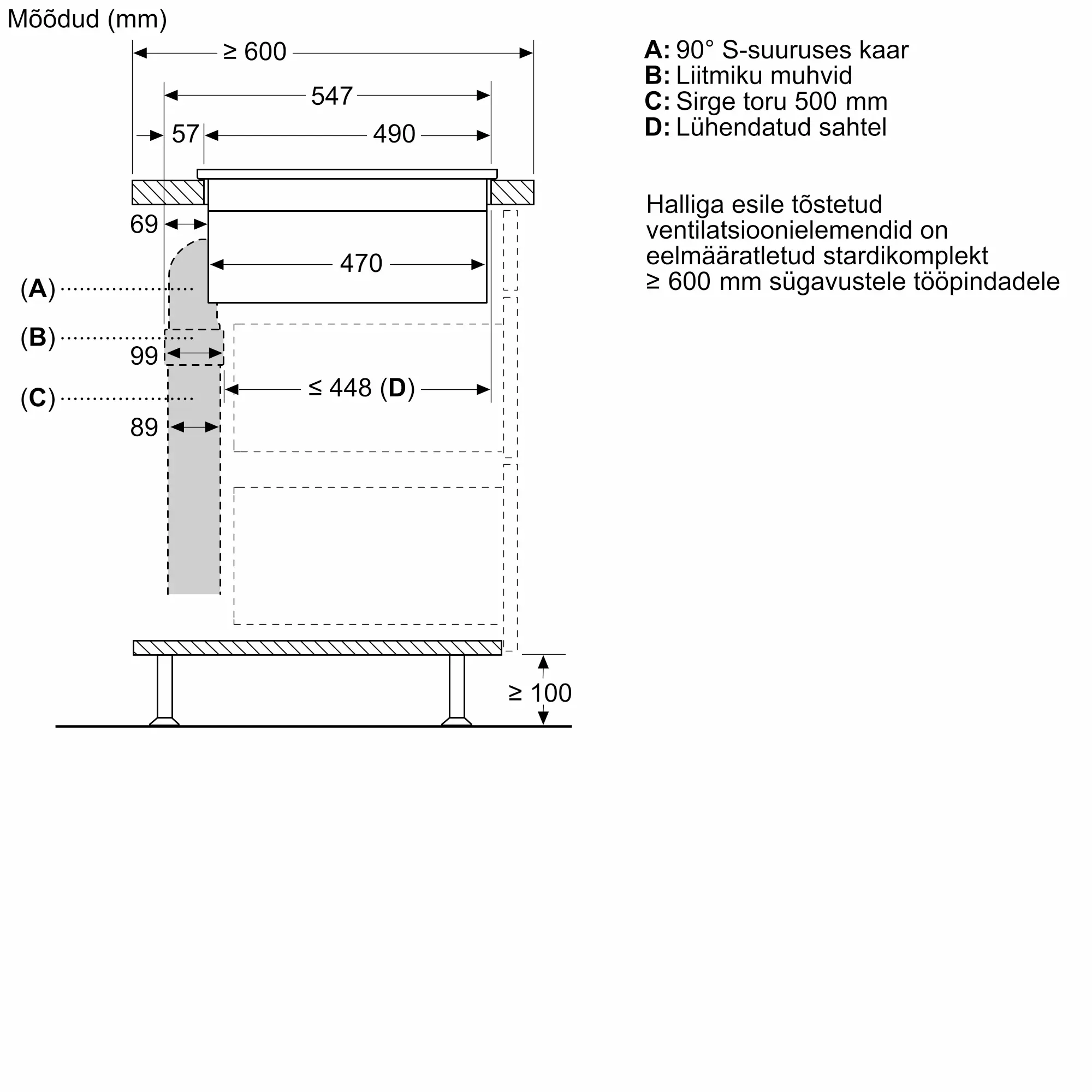 Tarvikute stardikomplekt integreeritud ventilatsioonimooduliga pliidiplaadi toruühendusega äratõmbele vähemalt 60 cm sügavuste tööpindade puhul.